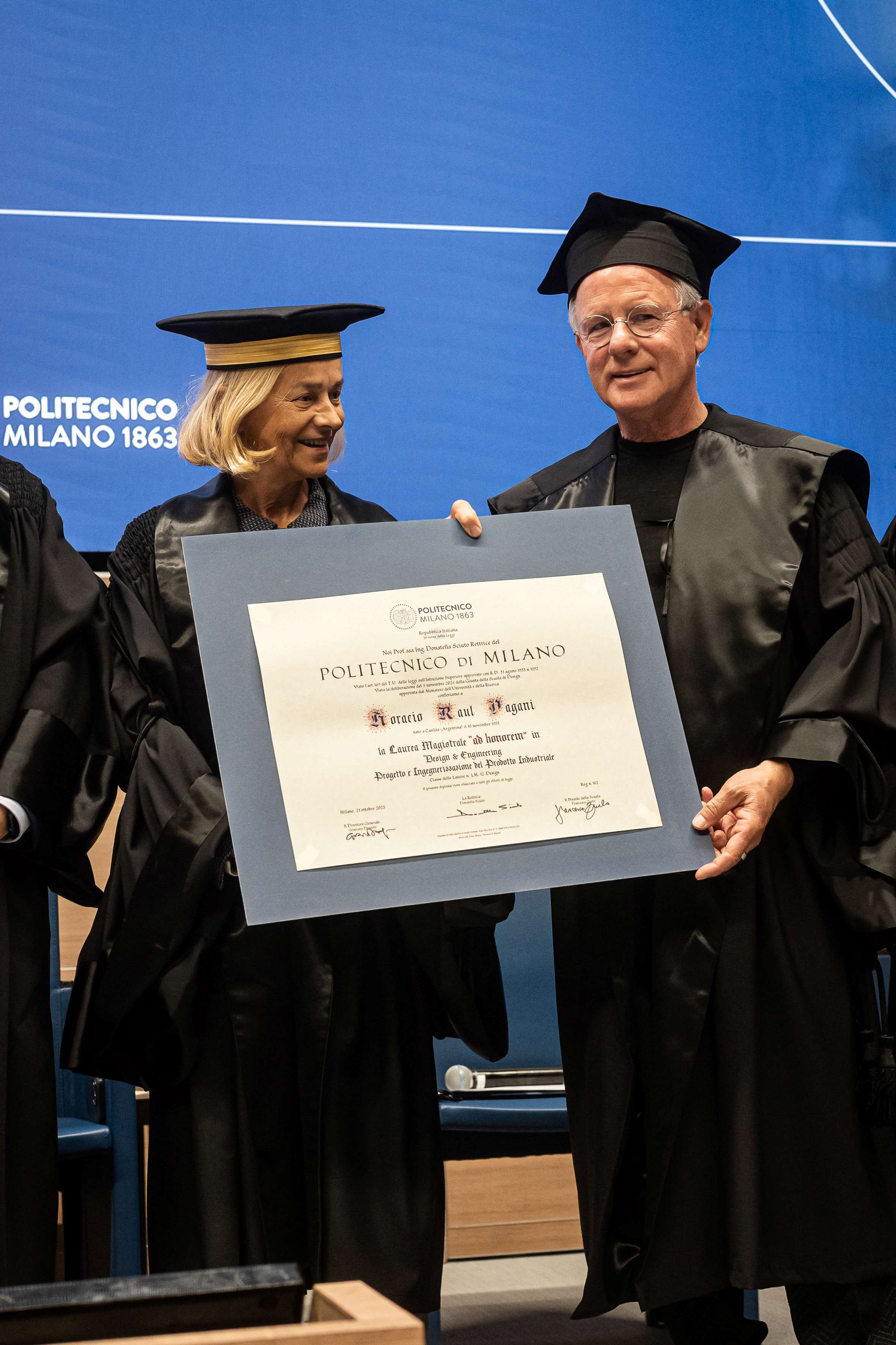 “La Laurea ad honorem in Design & Engineering conferita a Horacio Pagani rappresenta il riconoscimento di un percorso creativo e professionale che incarna in modo esemplare la sintesi tra arte, scienza e tecnologia — i tre pilastri fondativi della cultura politecnica. La motivazione di questo conferimento risiede nella straordinaria capacità di Pagani di fondere innovazione tecnologica, sperimentazione sui materiali e ricerca formale, nel solco della grande tradizione dell’automobile sportiva italiana. La sua opera esprime una visione in cui il pensiero progettuale si unisce alla perfezione ingegneristica, restituendo automobili che sono al tempo stesso oggetti di altissimo contenuto tecnico e opere d’arte contemporanea.